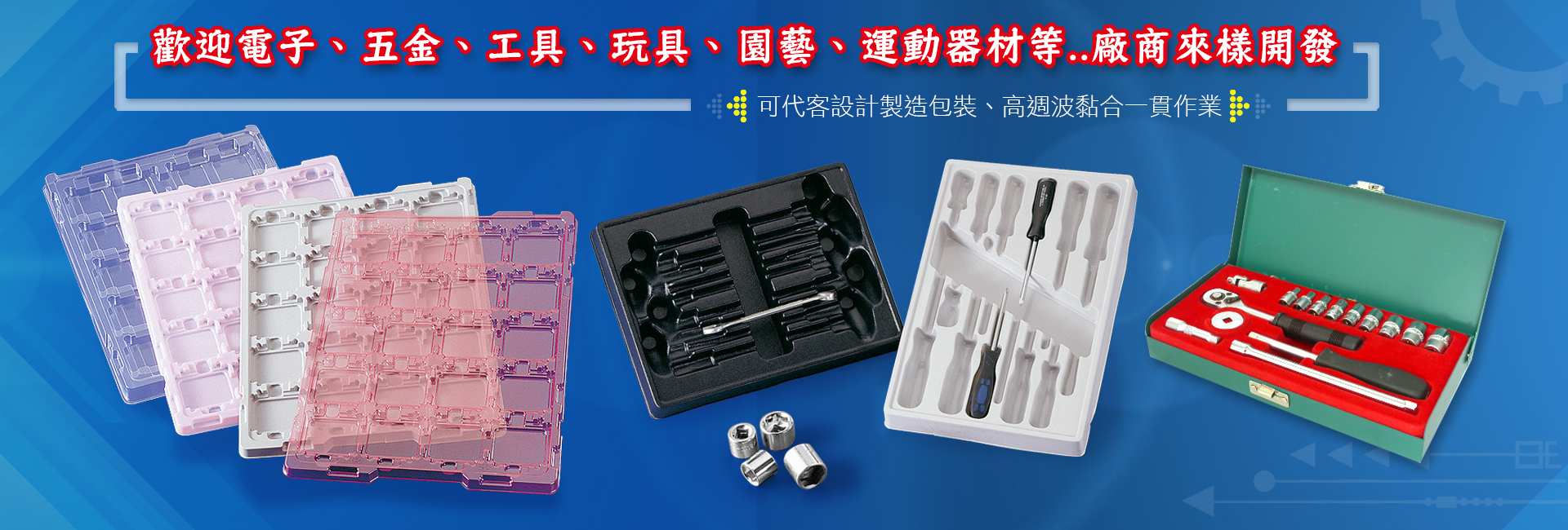 歡迎電子、五金、工具、玩具、園藝、運動器材等廠商來樣開發。可代客設計製造包裝、高週波黏合一貫作業。